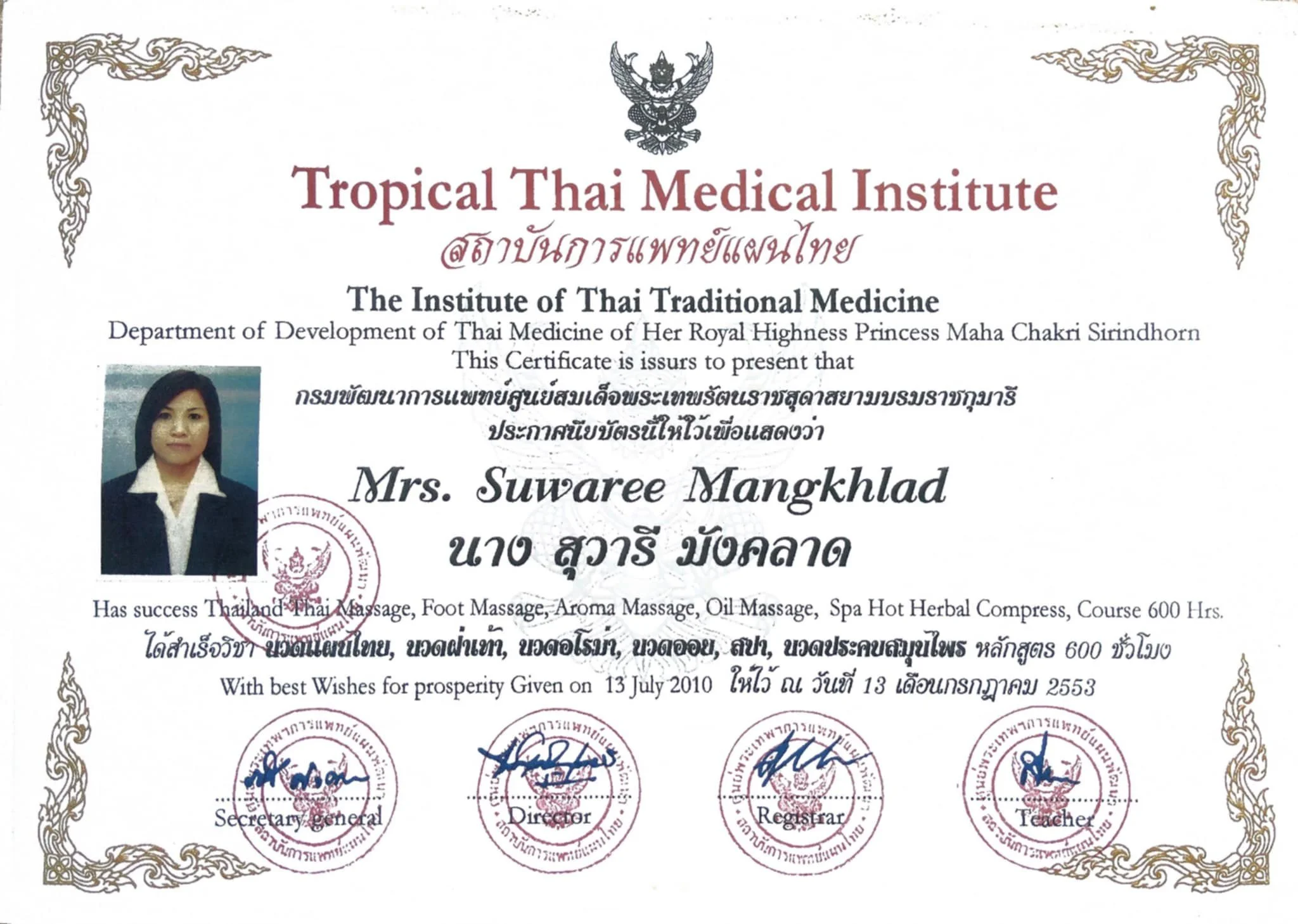 Suwaree Leitsch bietet qualifizierte und profesionelle Thai Massage mit langjähriger Erfahrung. Frauen, Männer und Kinder finden ganzheitliche Behandlung und Entspannung für Körper und Geist. Sie verfügt unter ihrem früheren Familiennamen Mangkhlad über mehrere Ausbildungszertifikate.